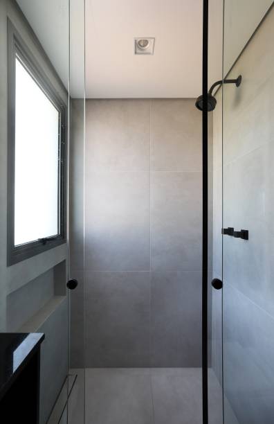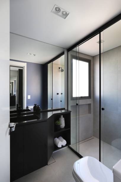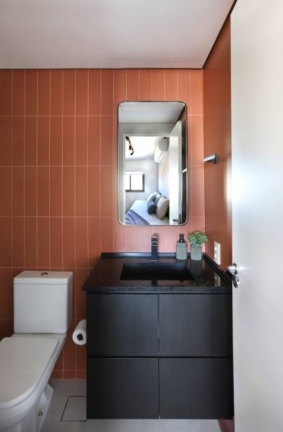 No banheiro da suíte o diferencial fica por conta do box com a abertura central, essencial para garantir uma boa passagem, já que está entre a bancada e o vaso sanitário. A cor está impressa no revestimento tijolinho Colores na cor azul e no banheiro do home office na cor mais rosada.