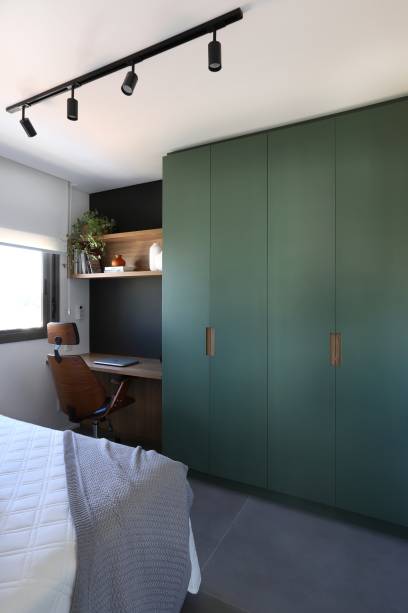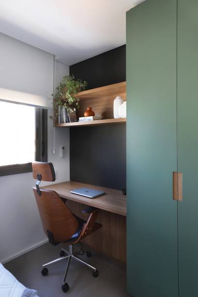 Um dos quartos foi transformado em home office, já que o jovem executivo realiza trabalhos híbridos (casa e empresa). Neste ambiente, os armários com cava em MDF Carvalho Hannouver harmonizando com o mesmo acabamento da estação de trabalho, ganharam revestimento em MDF na cor verde para manter luz e vivacidade no espaço onde se requer concentração. Já que a cor preta induz ao descanso.