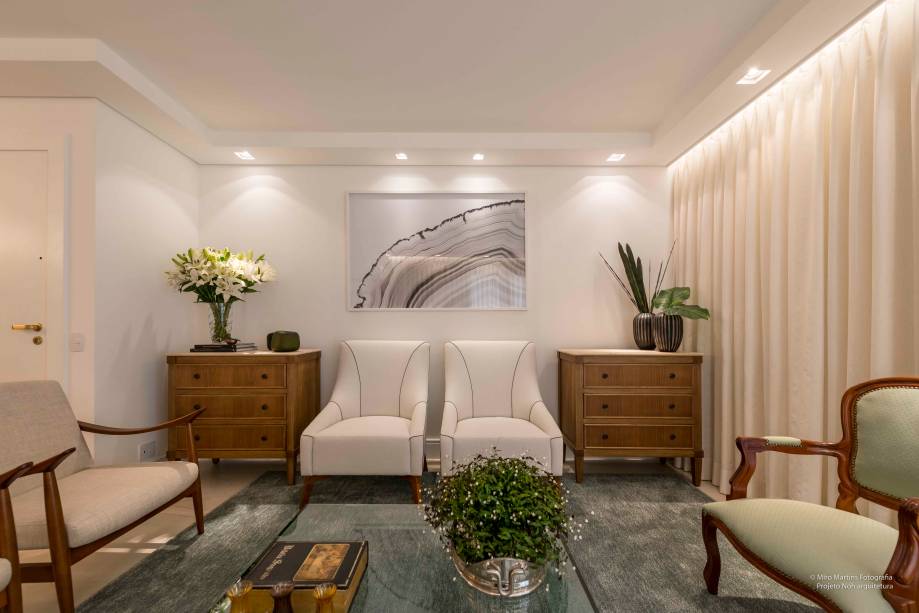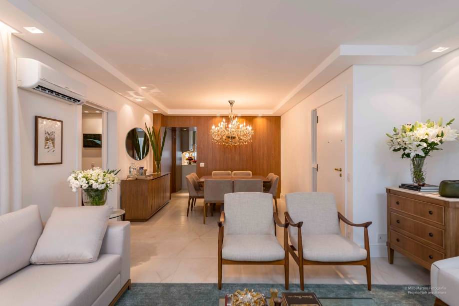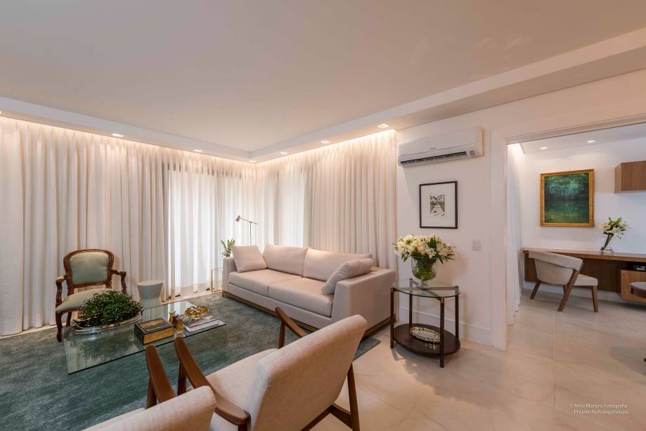 O projeto luminotécnico desse lar não foi deixado ao acaso. A iluminação indireta foi empregada com maestria, proporcionando diferentes cenários que se adaptam às diversas situações do dia a dia. Da sala de estar à cozinha, cada ambiente recebeu cuidadosamente a luz adequada, ressaltando detalhes e criando uma atmosfera envolvente. “Agora, este apartamento é um reflexo do estilo de vida contemporâneo e sofisticado de seus moradores”, concluem os arquitetos.