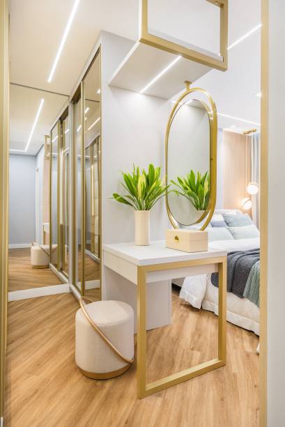 A área do quarto do casal também foi muito bem aproveitada, nele, o closet com portas espelhadas mantém tudo organizado. Há ainda bancada para maquiagem e muitos compartimentos que expõem e organizam os itens, conforme solicitado pelos clientes.