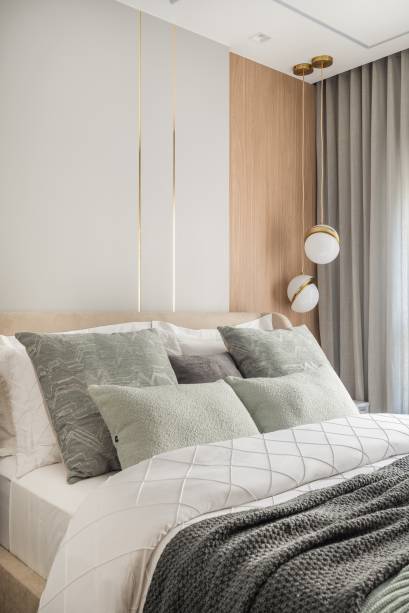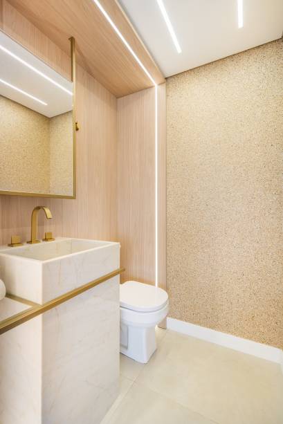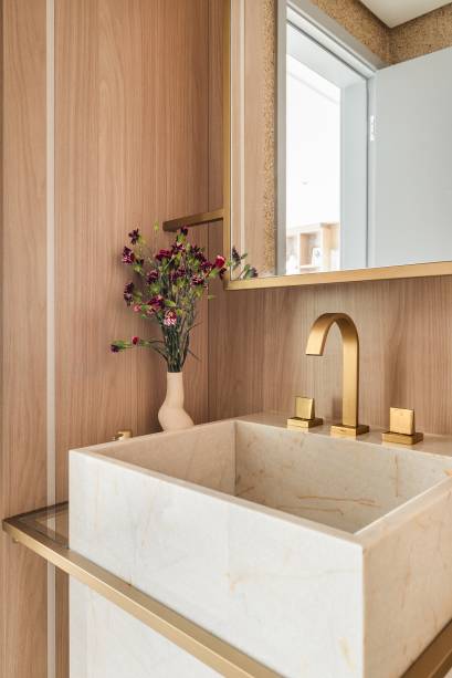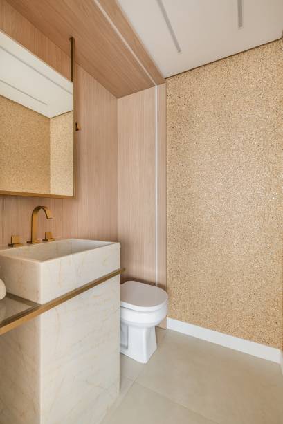 No ambiente, a paleta clean tem toques de dourado, imprimindo elegância e sofisticação.