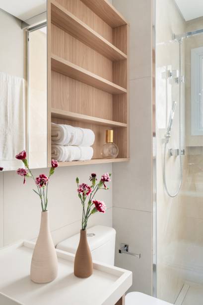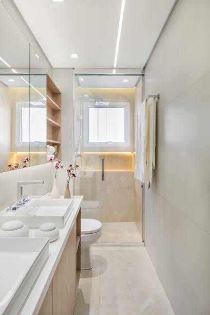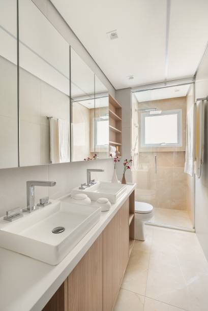 Para melhorar o conforto do casal, o banheiro da suíte tem bancada dupla e mantém o toque clean do apartamento.