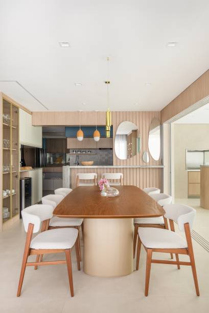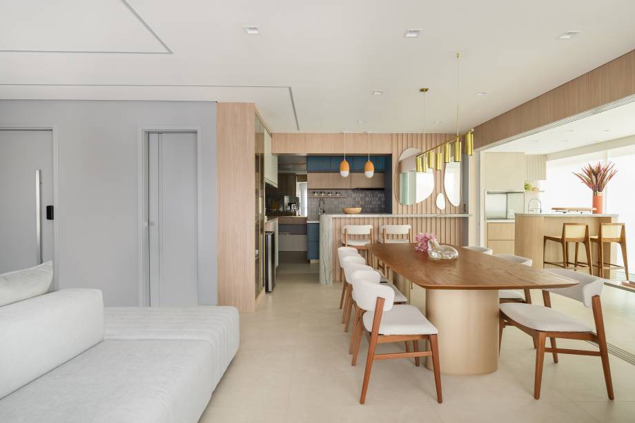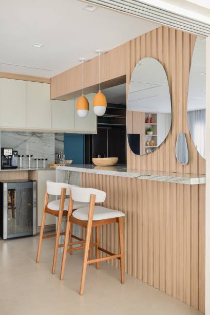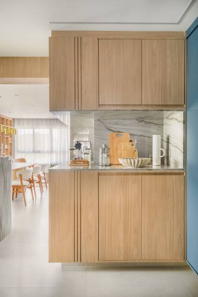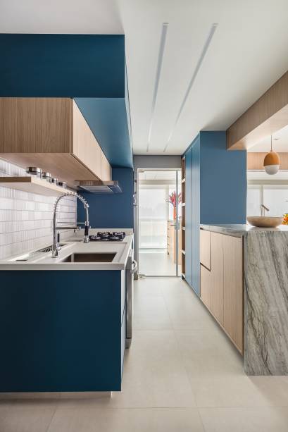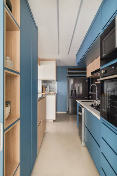 Marcada pelo tom de azul e madeira natural escolhido para a marcenaria, o local conta com muitos compartimentos para armazenamento, e é delimitado com a área social pelo balcão para refeições rápidas.