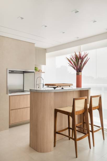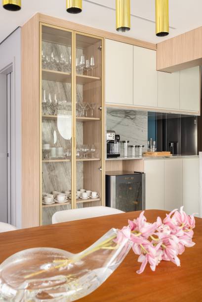 Ao lado dele, outro balcão traz o frigobar junto a uma charmosa cristaleira, que expõe e organiza taças e outros itens.