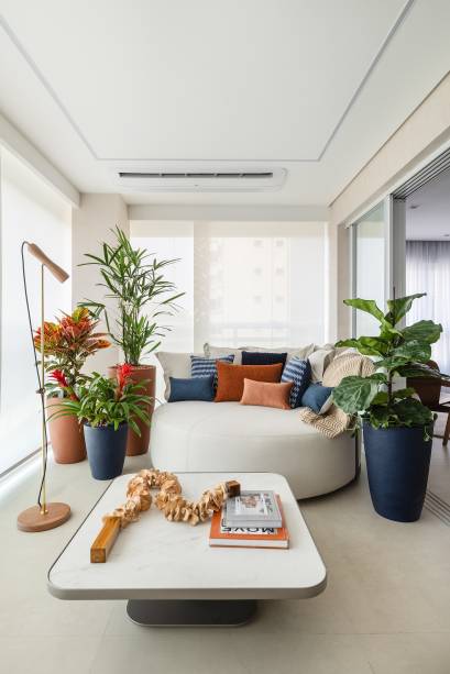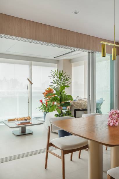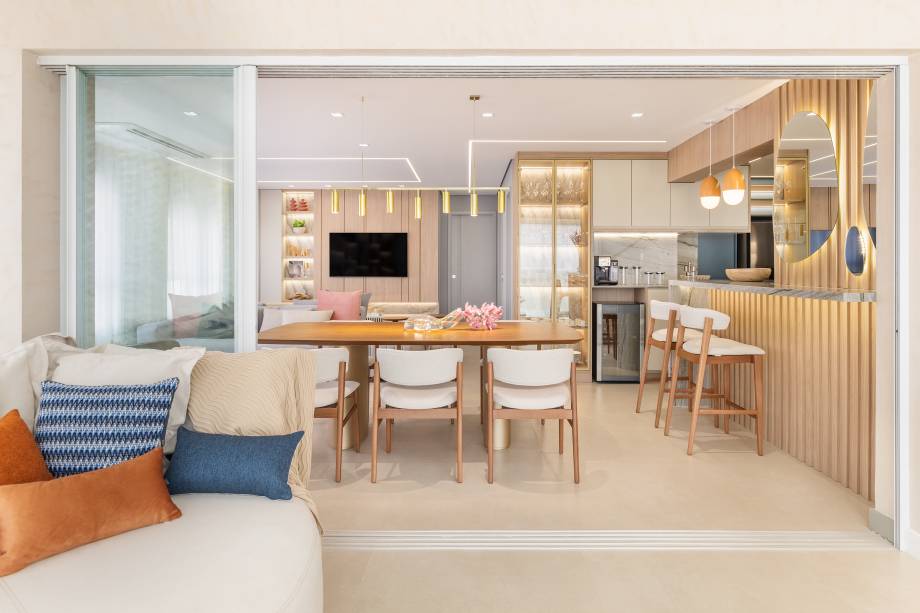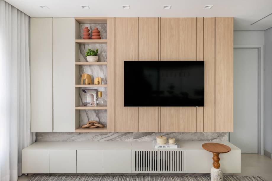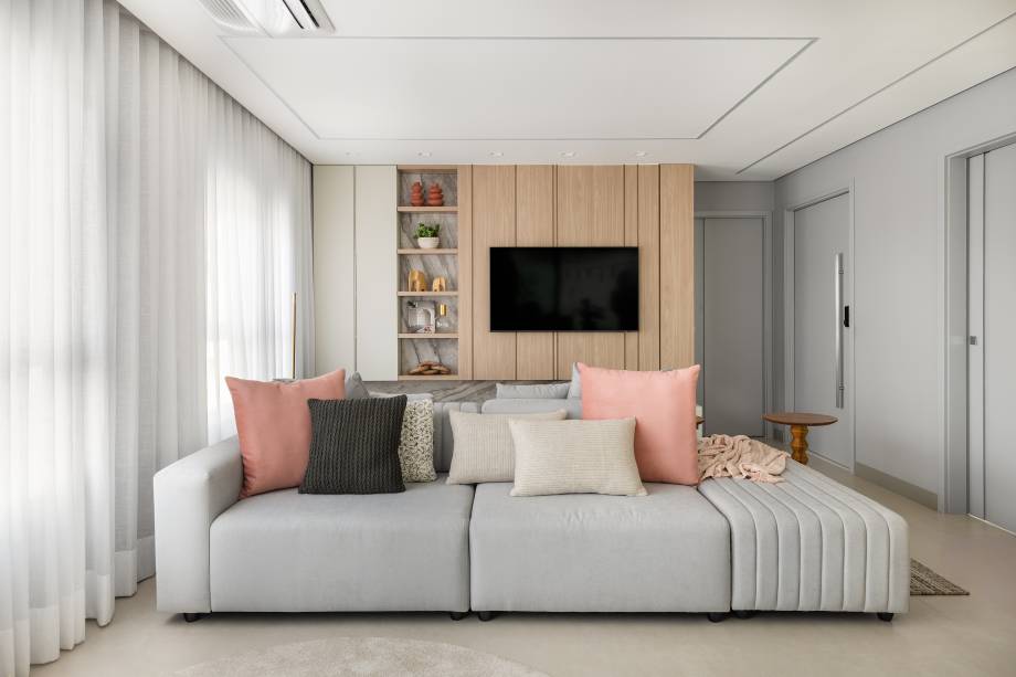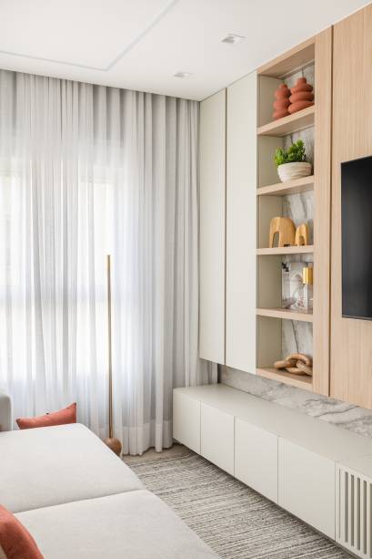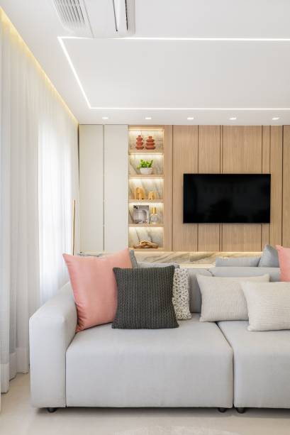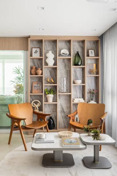 Ainda no ambiente, a parede que separa o living da varanda, foi revestida de porcelanato e recebeu nichos de marcenaria em diferentes tamanhos, criando uma estante para expor objetos de decoração. O detalhe da iluminação, cria um ambiente perfeito para relaxar.