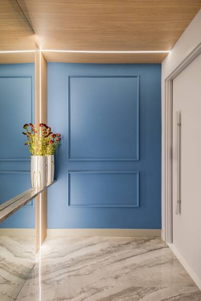 Marcenaria personalizada e cozinha azul são destaques em apê