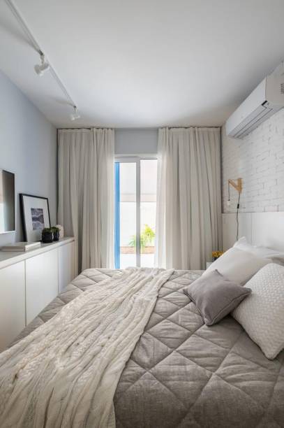 O quarto do casal recebeu piso, revestimento, marcenaria, elétrica e iluminação nova, além de isolamento acústico para evitar que os ruídos externos atrapalhem o silêncio e tranquilidade do casal. As portas de madeira veneziana foram pintadas no tom de azul.