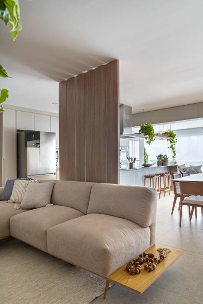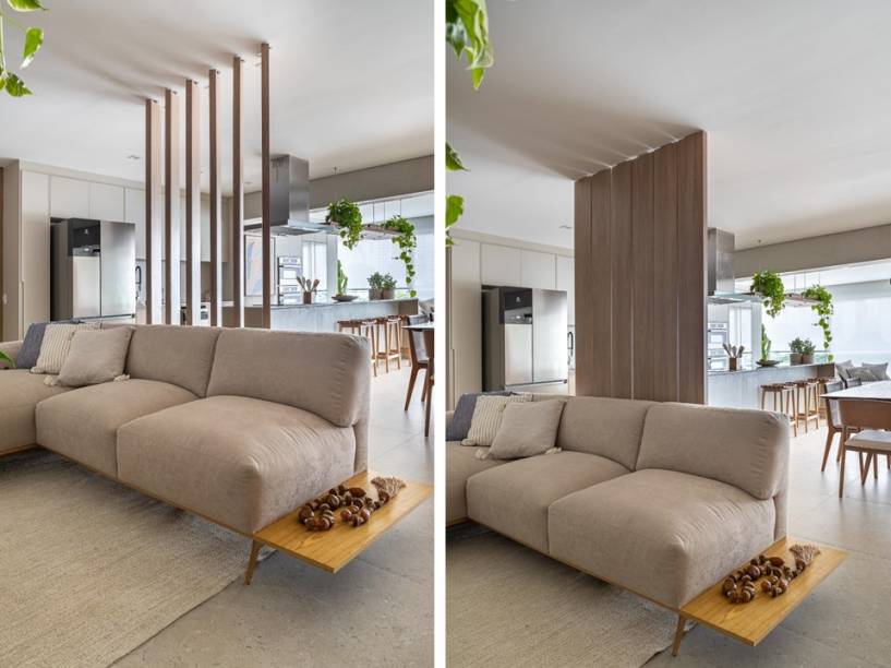 Apê ganha ilha de cozinha espaçosa e brises delimitando sala de TV