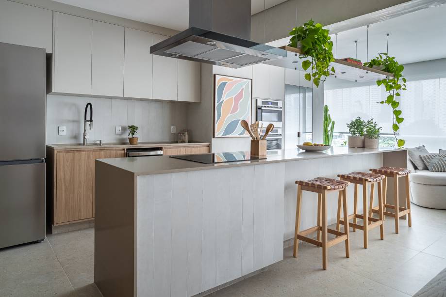 As arquitetas também optaram por utilizar materiais de ponta, como porcelanato em grande formato e bancada em quartzo, aliados a metais de última geração, incluindo uma torneira multifuncional com filtro. Elementos como uma prateleira acima da ilha proporcionam coesão visual, harmonizando ambientes com diferentes alturas de pé-direito. A escolha cuidadosa de materiais, pinturas e revestimentos, seguindo uma paleta de tonalidades, contribui para uma atmosfera atemporal e sofisticada.