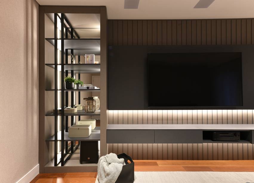 O home theater integrado ao living e ao terraço é setorizado com uma brise horizontal, que divide os espaços de forma leve, sem impedir a passagem da luz natural.