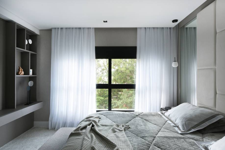 Já o closet master feito todo em vidro incolor possui iluminação indireta, que permite um visual bem atual e funcional no dia a dia.