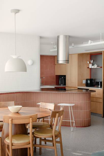 Como solução para integrar as áreas sociais e íntimas, os arquitetos projetaram, ainda, uma marcenaria multifuncional, que organiza os armazenamentos enquanto garante praticidade e organiza os espaços do apartamento. Outro importante elemento do projeto é a ilha da cozinha, desenhada em formato fluido e com acabamento em terracota, que se conforma como o ponto focal da área de estar da cozinha e da sala.
