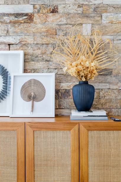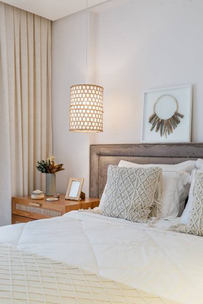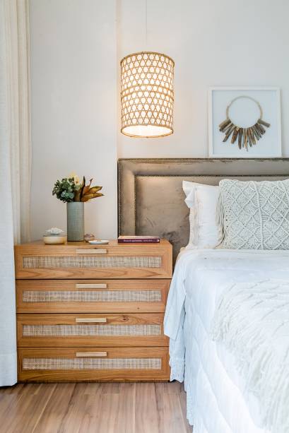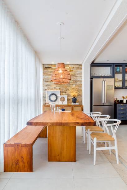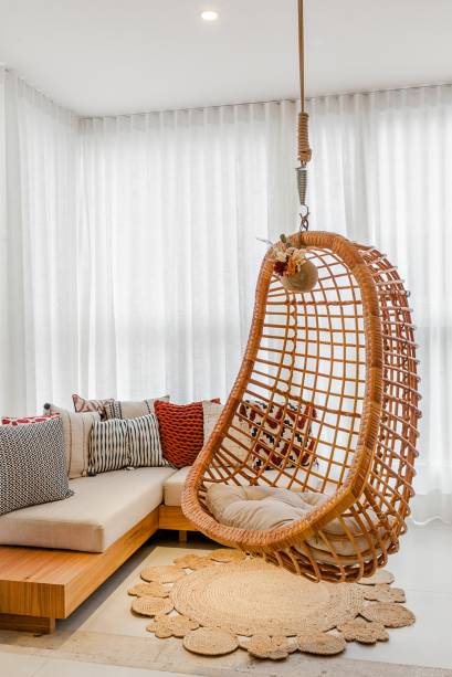 Na sala, o destaque vai para o sofá e para o buffet em desenho tipo espinha de peixe. A varanda dispõe de uma cadeira suspensa em rattan para os momentos de descontração. Já a sala de jantar possui uma mesa em madeira maciça de Peroba com acabamento rústico e cadeiras Wishbone com trançado em palha natural em seu assento. Para o quarto, foram feitas cabeceiras sob medida com detalhes em palha natural.