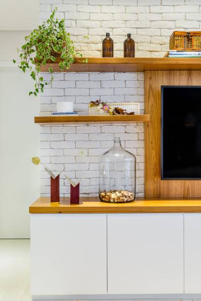 Móveis em madeira maciça e tijolinhos dão toque rústico à apê leve e claro de 70 m²