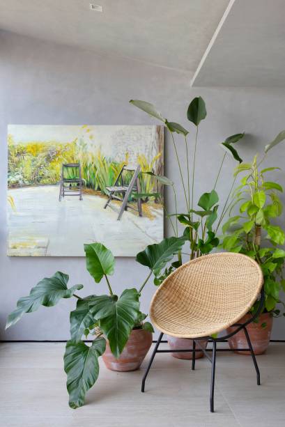 “Na sala de jantar, o painel em marcenaria, em um tom claro de madeira, contrasta com os móveis ebanizados. Na sala de estar, o tijolinho branco confere um clima mais despojado, aliado à iluminação em trilhos. Na varanda, a textura de cimento queimado cobre piso, paredes e teto, formando uma caixa. A serralheria na cor preta e os móveis com fibra natural complementam o visual”, explica o arquiteto.