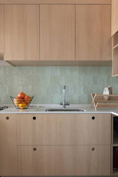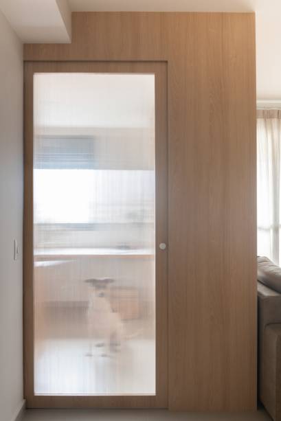 A separação entre a cozinha e a sala acontece através de um elemento ripado multifuncional: abaixo da televisão funciona como aparador e armário para itens eletrônicos; na divisão entre a sala e a cozinha, funciona como bancada de trabalho e apoio para servir; e, do lado da cozinha, é um espaço de armazenamento que comporta as louças.