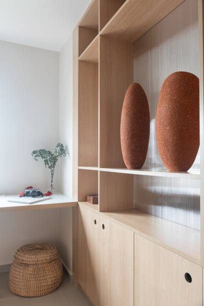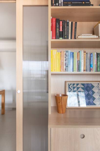 Por ter sido desenvolvido ao longo da pandemia, as áreas sociais foram as grandes protagonistas. Para que as duas moradoras pudessem manter suas atividades profissionais de casa durante o mesmo período, foi criada uma estante de marcenaria e fechamentos de policarbonato. Ela cria um pequeno escritório no estar sem prejudicar a integração e a passagem de luz.