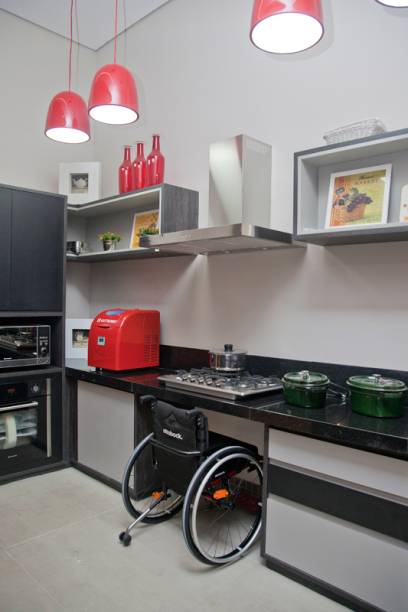 Colocar os ítens lá exigiu pequenos cuidados. Por exemplo: portas e corredores têm mais de 95 cm de largura para a moradora com deficiência circular facilmente. Os móveis são arredondados, diminuindo a chance de esbarrões. O piso recebeu laminado de madeira antiderrapante para a cadeira não deslizar. Cozinha e banheiro foram revestidas com cimentício.
