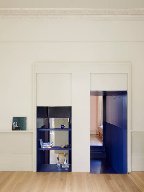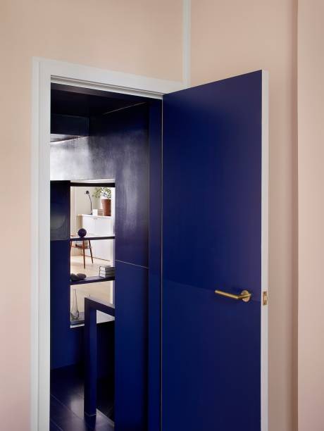 Tudo além do datum de latão é azul escuro nesta área. Não apenas as paredes são pintadas dessa cor, mas o piso, que é da mesma madeira de todos os outros lugares do apartamento, é manchado pelo azul.