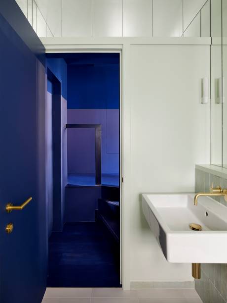 Usando cores neutras claras nos ambientes, o tratamento da pintura muda drasticamente para azul escuro na escada central.