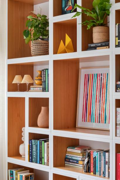 Como o casal ama livros, o projeto incluiu uma biblioteca semi-integrada à sala de estar. O ambiente, aconchegante para leitura, possui uma grande estante desenvolvida com três medidas de caixas soltas que se sobrepõem formando um “tetris” – estrutura que facilita a montagem e desmontagem do móvel.