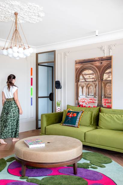 Por ser novo, o apartamento foi entregue pela construtora sem nenhum material de acabamento e todas as definições partiram do zero. Na área social, a arquiteta pintou o teto de branco e as paredes num tom areia para deixar a base neutra e assim destacar alguns móveis coloridos e, em especial, o tapete customizado por ela para o ambiente de estar (fornecido pela Paola Muller), que virou o ponto focal do projeto.