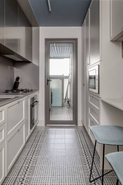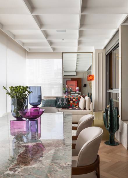 Segundo a arquiteta, houve poucas alterações na planta original proposta pela construtora: a varanda, antes isolada, foi integrada à sala e a largura da cozinha foi ampliada para caberem mais armários. No living, a combinação de boiseries, florões e sancas com forro em colmeia na antiga varanda foram fundamentais na construção de um projeto que lembra o estilo europeu, porém sem ser rebuscado. “A ideia era deixar o apartamento chique e, ao mesmo tempo, com uma identidade contemporânea”, informa ela.