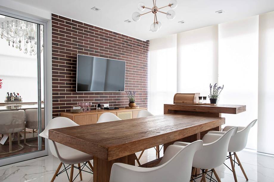 A cozinha exibe um design elegante provençal, com pisos e paredes revestidos em porcelanato. Na área gourmet, a parede de tijolinhos adiciona um charme rústico ao ambiente, enquanto a mesa robusta de madeira maciça e o buffet com televisão complementam o espaço.