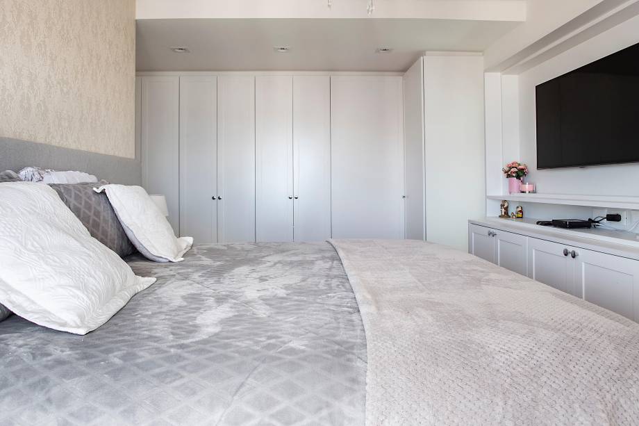 A suíte master redefine o conceito de refúgio, apresentando um closet amplo que promete organização e elegância. A paleta de cores é dominada por tons de branco, conferindo ao espaço uma atmosfera de serenidade e pureza.