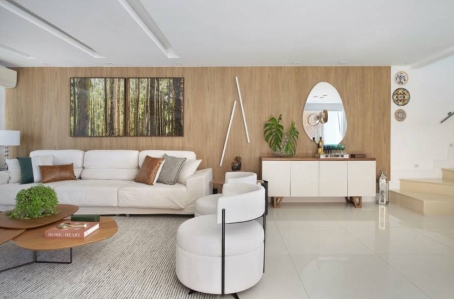 Nesse espaço, cores neutras foram escolhidas como a base do projeto. Segundo Guilherme, a configuração original da sala também foi mantida, pois ela já tinha um layout que funcionava bem. O painel de madeira atrás do sofá proporcionou um ar mais aconchegante ao espaço. Tudo seguindo a paleta neutra.