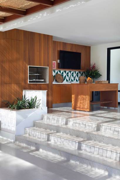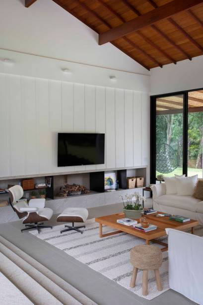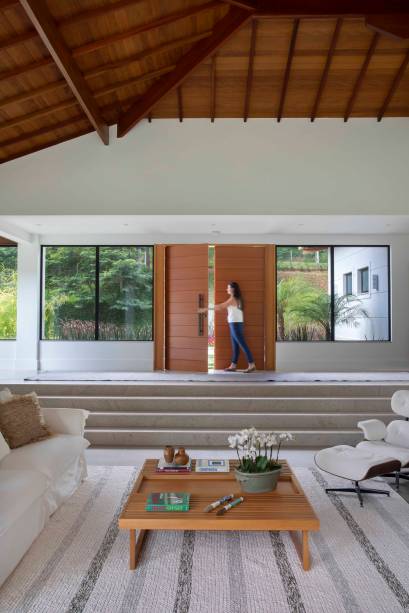 Essa proposta predomina especialmente na área social: “quando você entra na sala, você vê através dela, vê o jardim do outro lado. O pé-direito alto, com madeiramento do telhado aparente, reforça a sensação de amplitude”, descreve Bitty.