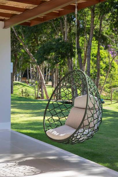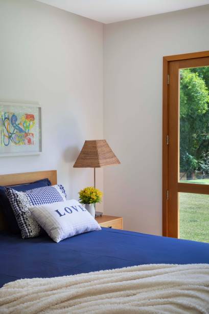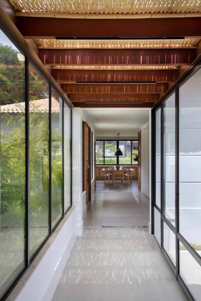 Já os quartos contam com maior privacidade, mas continuam integrados ao jardim por portas que abrem para fora da casa. “Fizemos também uma passagem entre os blocos da área social e íntima como se fosse um corredor transparente, com vidro nas laterais e no teto, com cobertura de palhinha. Por ali, você também pode acessar o jardim da piscina”, explica Cecilia.