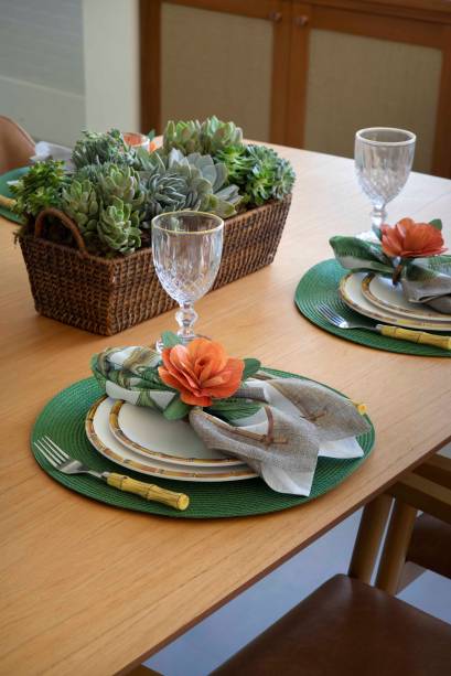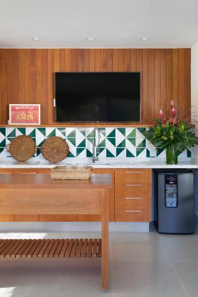 Para compor os interiores com toda essa interferência externa, a paleta de cores adotada é suave e natural, com elementos em madeira na sala e na varanda gourmet, e toques de verde na cozinha, que ganhou armários laqueados nessa cor. A casa inteira tem o mesmo piso, um porcelanato cinza-claro, em prol da praticidade e facilidade de manutenção.