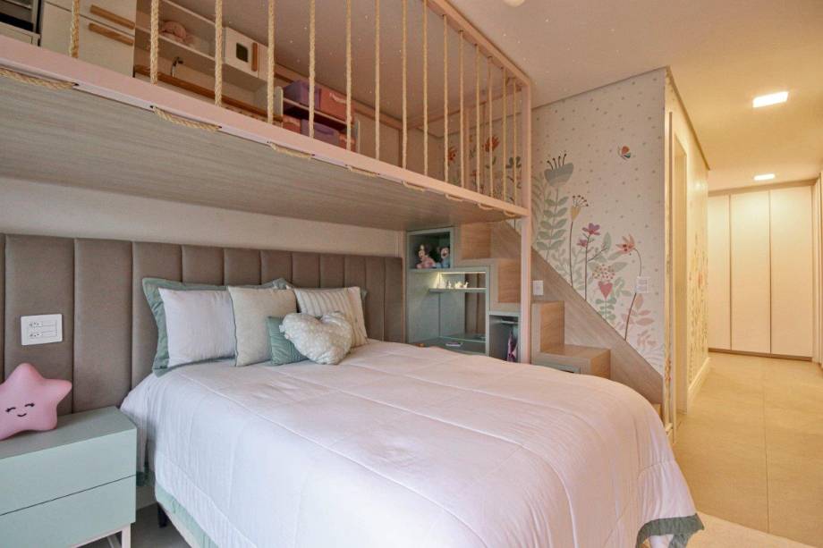 No pavimento superior estão as dormitórios das filhas: são duas meninas de idades e personalidades bem diferentes. Uma recebeu um quarto clássico, com boiserie na parede e cabeceira de capitonê. A caçula ganhou uma brinquedoteca suspensa com nichos de decoração e camarim embutido na escada.
