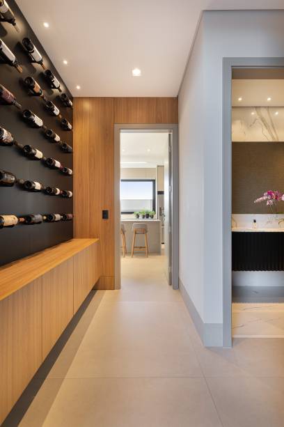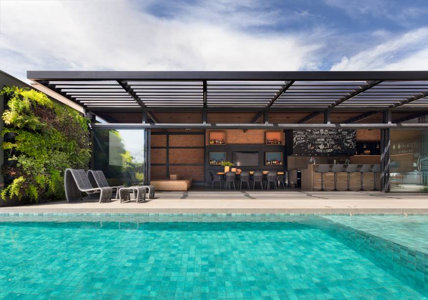Em um único pavimento, a distribuição da planta é feita com vista para o cenário ao redor, priorizando as suítes e as áreas de lazer e o social. O espaço gourmet surge separado do corpo da edificação e oferece um ar mais despojado dentro desse contato visual.