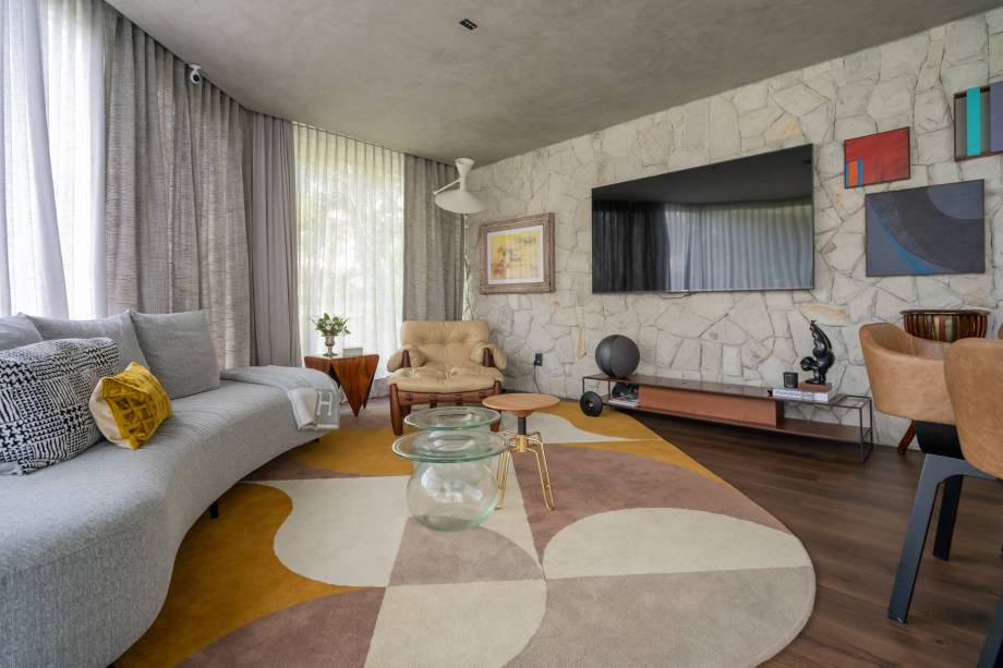 Destacam-se a parede revestida em pedra, as peças de mobiliário em couro e madeira, a poltrona Mole de Sérgio Rodrigues e a mesa lateral Pétala de Jorge Zalszupin, além de outras obras de arte e a luminária Meshmatics da Moooi.
