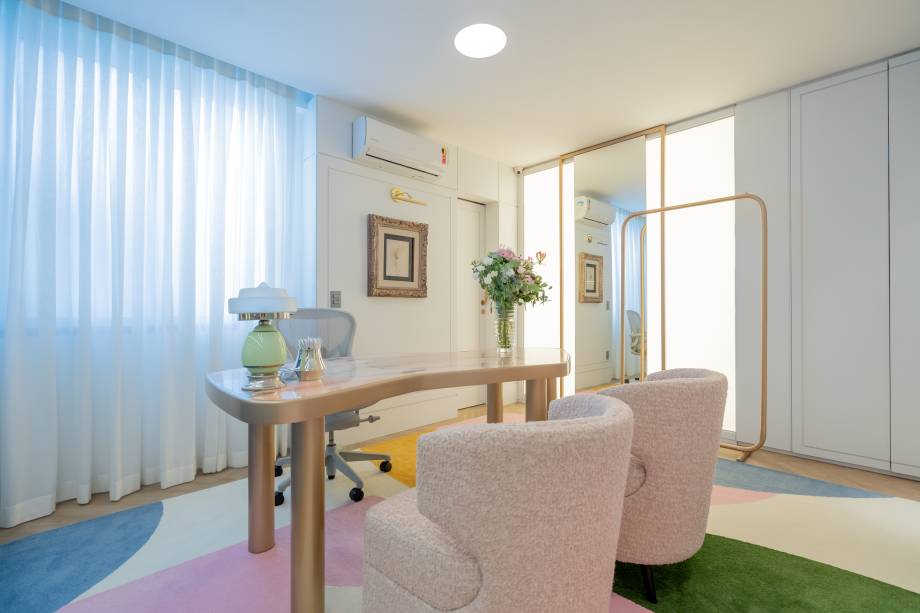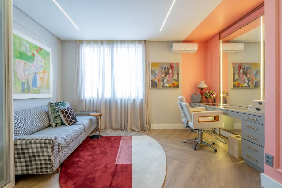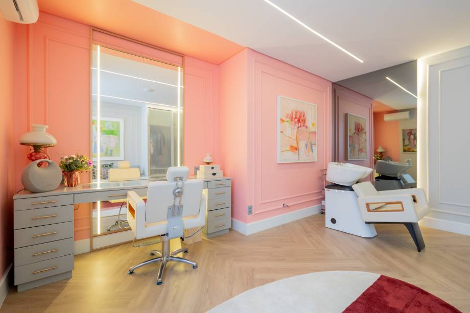 O charme da casa, porém, é o salão de beleza. Um espaço com paleta de cores suaves, o salão é o sonho de qualquer pessoa apaixonada por autocuidado e estética.