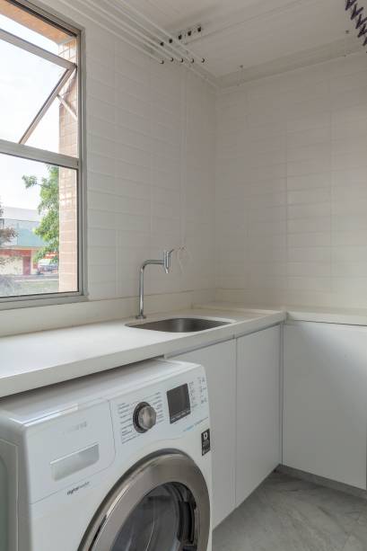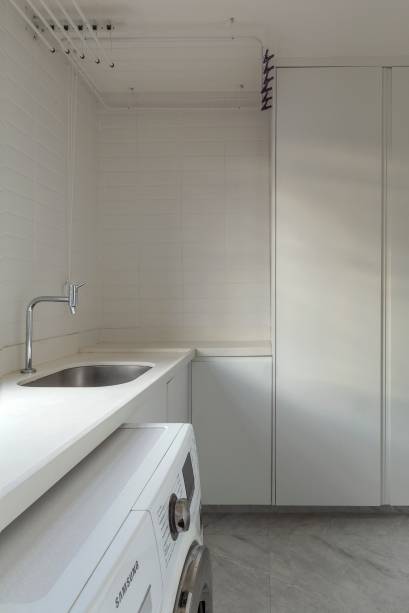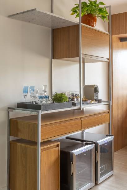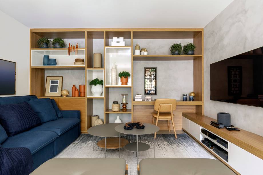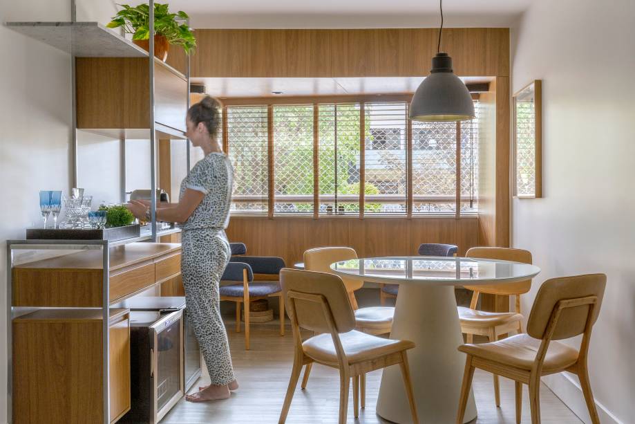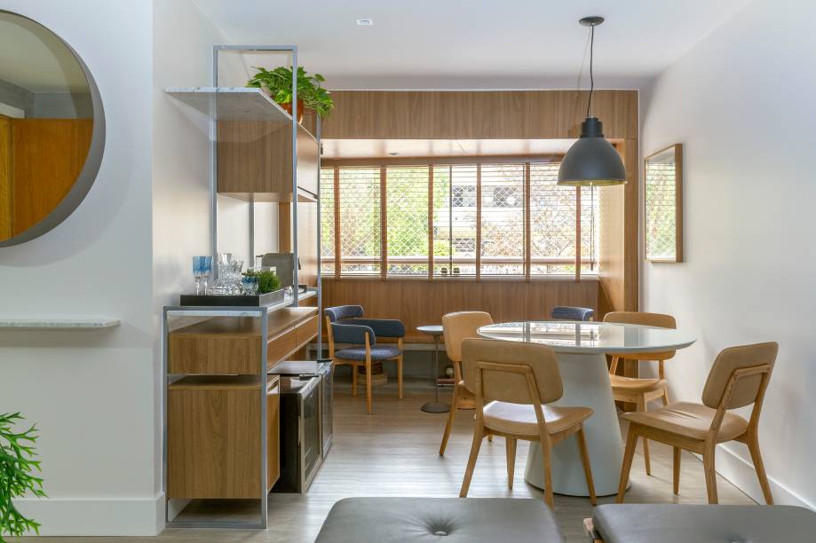 Neste local privado aos adultos, os profissionais desenharam um móvel bar, que funciona como apoio para servir as refeições e para os equipamentos como uma adega, um frigobar e uma máquina de café expresso. Todos esses cômodos, refletidos em um ambiente contemporâneo nas cores azul marinho – cor preferida dos moradores – com as paredes de base no cinza e branco.