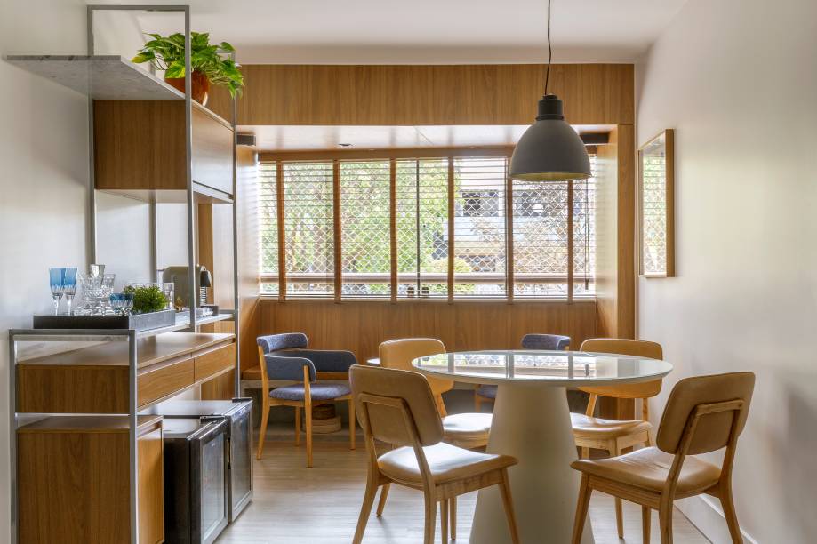 Além disso, no canto próximo a uma grande janela, foi criado um ambiente para o casal aproveitar um tempo a dois, degustando um bom vinho, por exemplo.