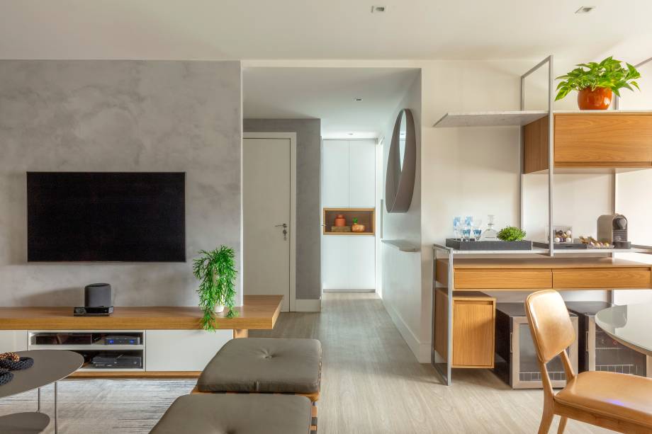 Casa de 89m² tem cantinho de bar, estar integrado e estante com nichos