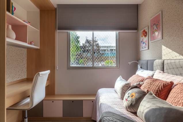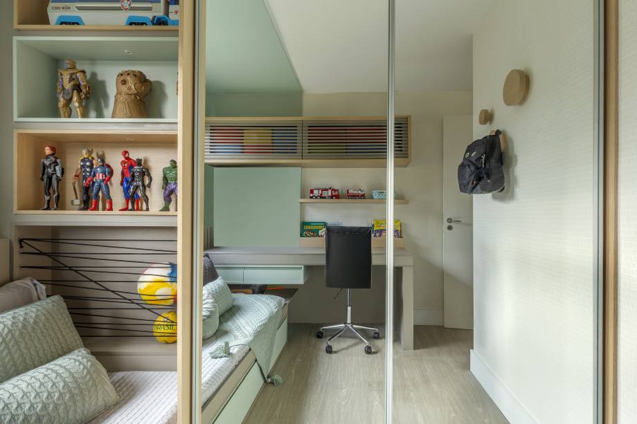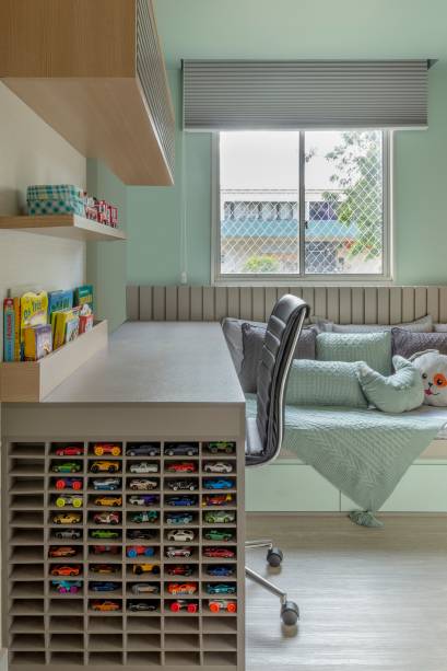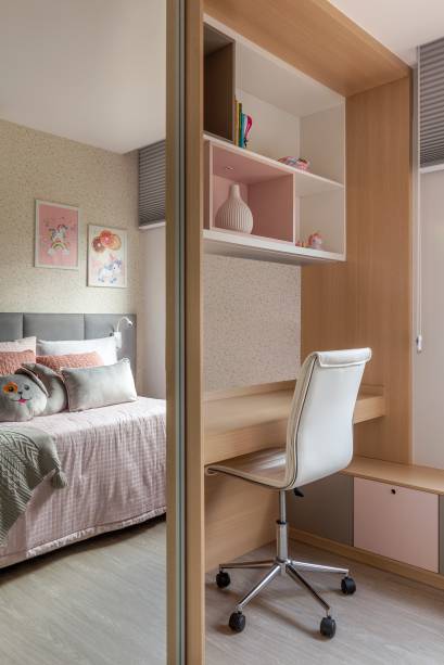 No quarto de ambos os filhos, foi projetado pensando no descanso e nos estudos, assim no cômoda da filha foi criada um rack, com prateleiras, embutido no armário e na do menino, o rack com prateleiras foi embutido na cabeceira da cama – ganhando mais espaço no quarto.