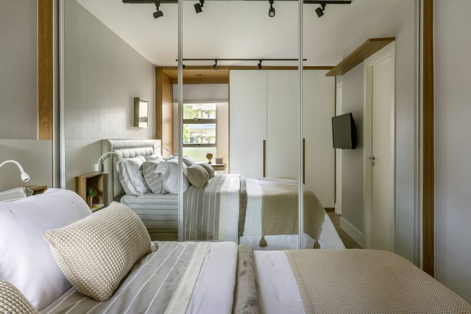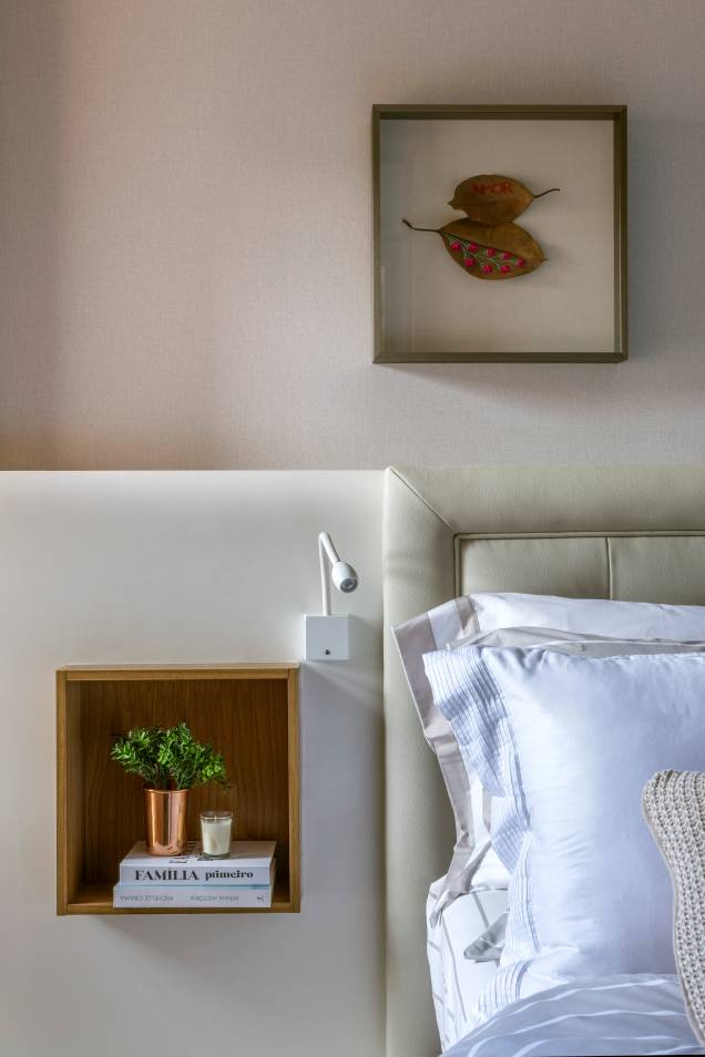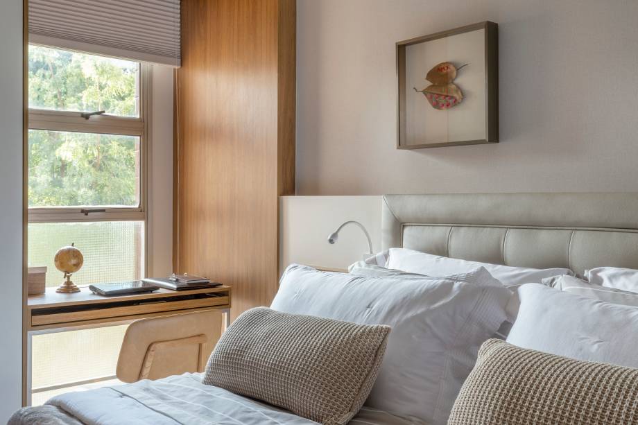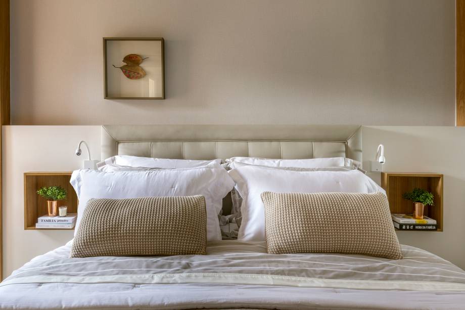 A ideia principal da área íntima foi para ser um local aconchegante, o escritório ampliou o quarto do casal para acrescentar uma mesa – onde os clientes pudessem trabalhar – e foi colocada uma cabeceira planejada de nicho embutido.