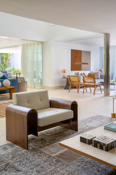 As poltronas giratórias tanto dão para as salas quanto para o jardim e a piscina, que tem um apoio com churrasqueira, forno de pizza, chaises e ombrelones. O balanço de fibra náutica é uma atração à parte para adultos e crianças.