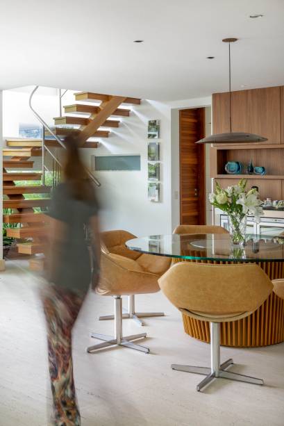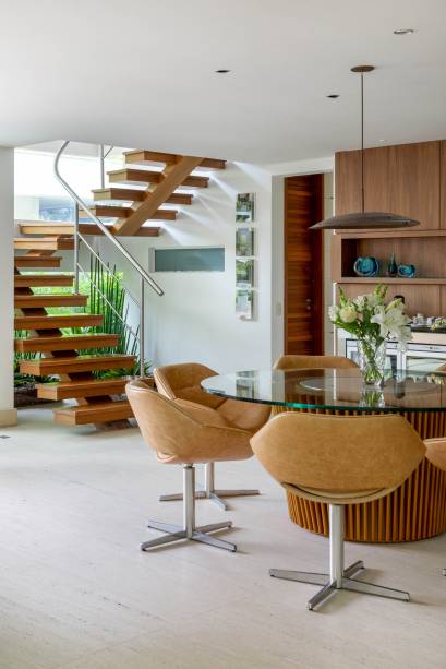 Alguns detalhes não escapam aos olhos. Como o pé direito duplo entre os dois andares que permite que se aprecie a área de lazer e é protegido por guarda corpos de vidro temperado; a luz que inunda os ambientes através dos janelões fixos da fachada interna;