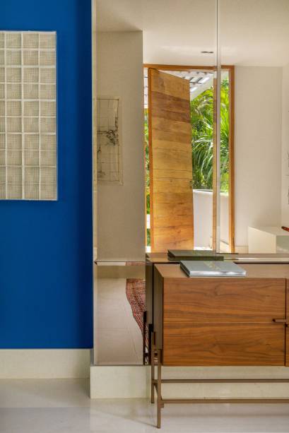 As varandas dos quartos cheias de plantas; a porta de demolição que leva à área social do segundo piso; a parede azul do living e a sala de jantar sóbria e elegante; o elevador, discreto, com uma moldura de aço, material também usado para revestir uma coluna estrutural que não pôde ser retirada; os móveis de design contemporâneo que dialogam com os móveis das áreas externas também merecem destaque.