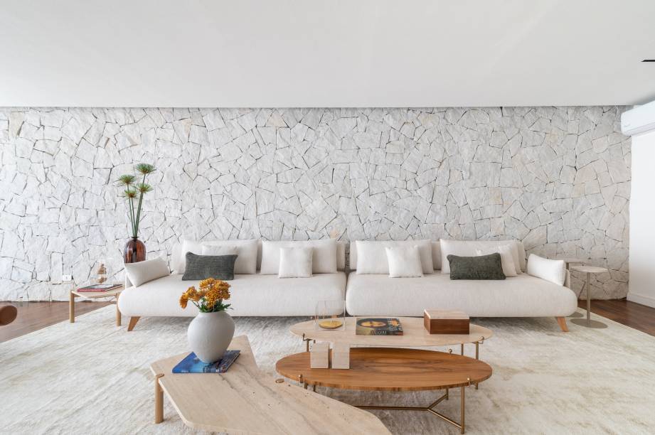 Casa tem ares rústico chic com mármore, pedras, seixos e madeira
