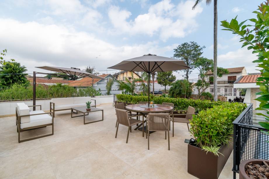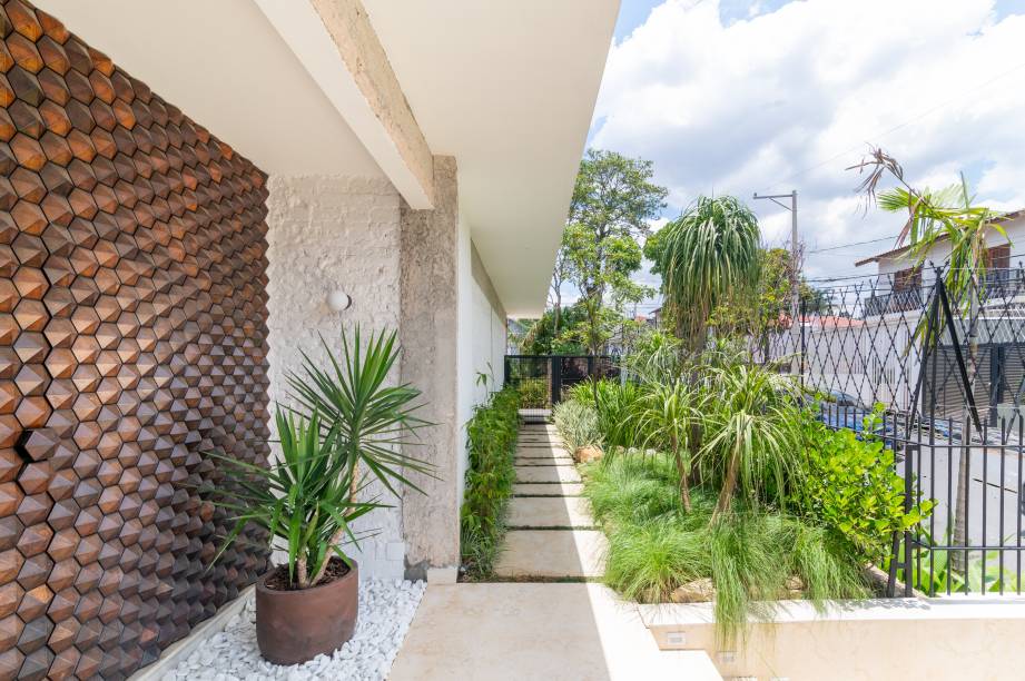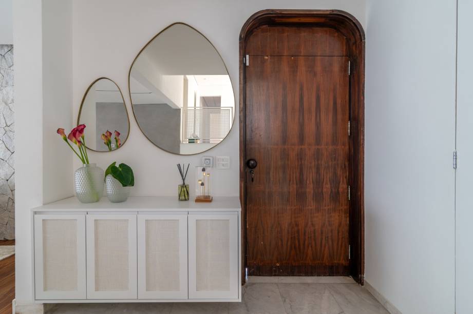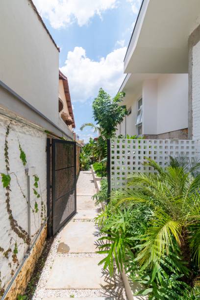Uma das intervenções mais significativas foi a reestruturação do layout da casa. O projeto integrou a cozinha, a área de serviço, o quarto de serviço e várias salas em um único ambiente fluido, unindo sala de jantar e cozinha. O piso de ipê e o mármore branco foram preservados, enquanto os quartos foram reconfigurados para incluir um closet, resultando em uma suíte master, um quarto de hóspedes e um escritório.
