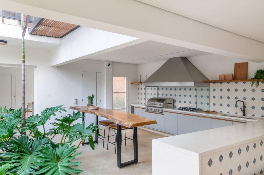 Os tons claros predominam, com elegantes bancadas de granilite, pedras travertino e ladrilhos em azul, criando um ambiente leve e arejado.