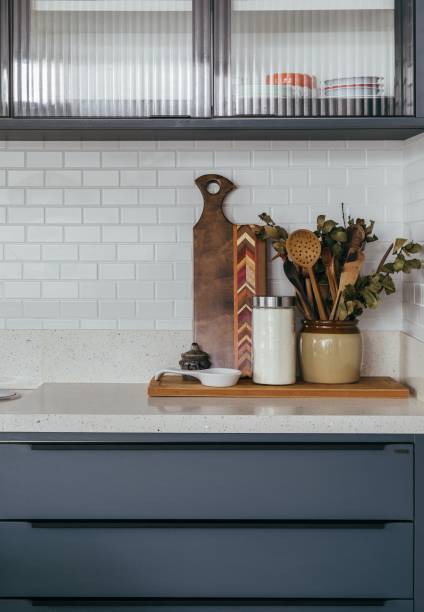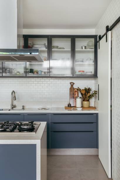 Integrada à sala de jantar, a cozinha passou por uma grande reformulação, ganhando uma ilha em marcenaria com tampo de pedra quartzo, com uma prateleira suspensa em serralheria preta e armários em vidro canelado.