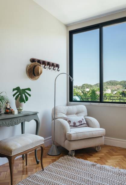 Um dos cômodos foi transformado em sala de meditação e local de hobbies da moradora que gosta de bordar e costurar. Criando unidade entre os ambientes do segundo pavimento, os outros quartos seguem a mesma paleta de tons claros e suaves.